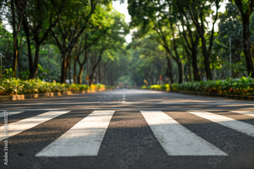 Quiet urban road with a pedestrian crosswalk surrounded by lush green trees and soft sunlight creating a peaceful and inviting cityscape atmosphere