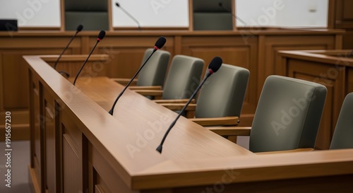 Image of a courtroom with microphones, empty chairs, and wooden furniture, depicting the atmosphere of legal proceedings