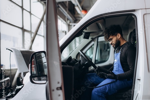 Mechanic diagnosing van engine using diagnostic tool
