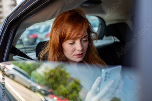 Young redhead woman using smartphone in car. Pensive female passenger looking at phone screen in vehicle. Digital lifestyle and transportation. Ginger girl with freckles texting in taxi ride.