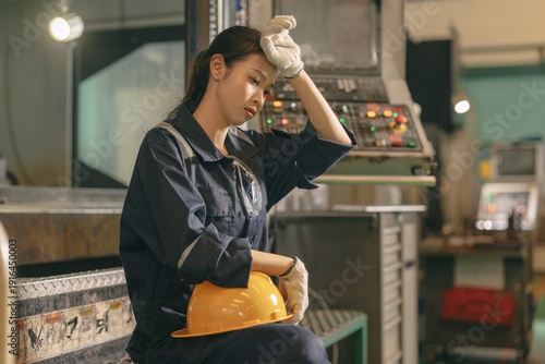 Young Asian woman worker hardwork in heavy industry, Engineer labor female tired fatigue exhausted