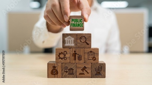 Public finance, government budget, fiscal policy, economic management, public sector, financial administration, investment planning concept with hand stacking wooden blocks.