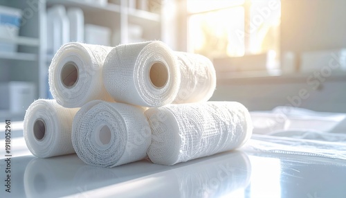 FlyPro Firefly high-resolution photograph of bright, clean, sterile medical gauze rolls, readily available for essential wound dressing and first aid.