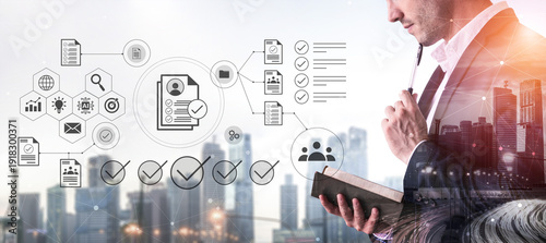 A businessman contemplates digital data, surrounded by urban architecture, embodying innovation and strategy for navigating modern business landscapes. Gantry