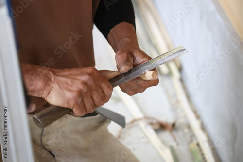 木材を削る男性