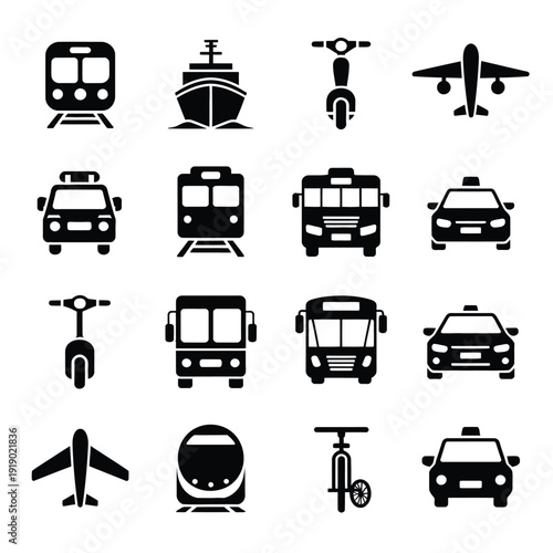 Transportation icon collection. Includes train, airplane, ship, bus, car, bicycle, scooter, motorcycle icons. Created in solid style with black and white palette