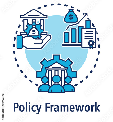 Policy Framework blue concept icon with Monetary Policy, Fiscal Policy, Corporate Governance.