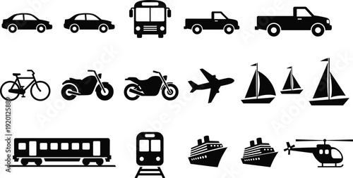 Transportation vehicle silhouette icon set vector illustration featuring cars, trucks, bus, bicycle, motorcycle, airplane, train and ships