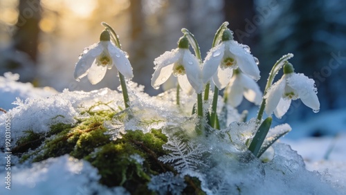 Close-up of fragile snowdrop flowers breaking through forest floor snow