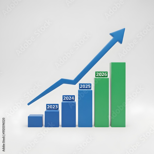 Three dimensional business bar chart showing rising trend from year 2023 to 2026 with arrow