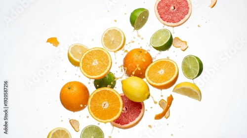 Citrus fruit slices, including orange, lemon, lime, and grapefruit, splash in midair with juice droplets, creating vibrant and refreshing composition on white background