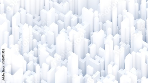 Abstract 3D render of white geometric blocks and pillars forming a dense cityscape-like pattern, creating a modern minimal architectural background with depth and shadows
