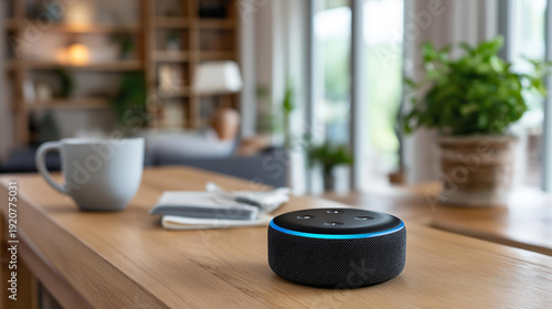 Home automation AI voice assistant control visualization, intelligent household management, smart home technology, voice-activated system representation, with copy space