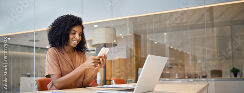 Happy young African American business woman holding smartphone sitting in office, smiling ethnic businesswoman using financial banking app on cell phone looking at cellphone working with mobile tech.
