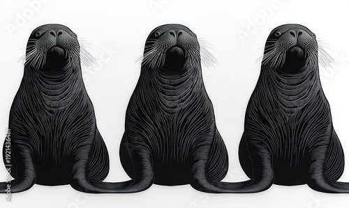 Three black stylized seals seated side by side on a clean white background, facing forward with whiskered muzzles and calm, curious expressions