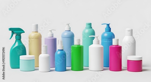 Assorted cleaning supplies and personal care products arranged neatly on a surface, showcasing various containers and dispensing methods