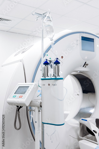 Bright radiology room with CT scanner and contrast medium. Diagnostic and patient care concept