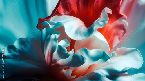 Delicate translucent flower petals with vibrant red edges. Soft lighting and botanical serenity. Close up of a blooming aquatic plant with a teal water reflection background