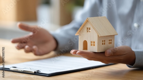 Divorce Lawyer Discusses Asset Division With Client Using House Model in Modern Office During Property Consultation