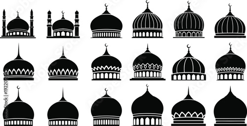 Collection of Various Black Mosque Silhouettes with Different Minaret and Dome Designs Isolated on White Background for Islamic Religious Designs