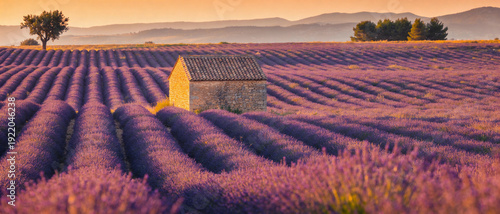 Beautiful panoramic view of a blooming lavender field in Provence, France, with a rustic stone hut at sunset. Golden hour light illuminates purple rows, distant mountains, and a peaceful horizon.