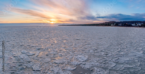Sonnenaufgang über der zugefrorenen Ostsee in Zinnowitz mit Blick nach Zempin, seltene Eisblumen auf der Meeresoberfläche, mystische Winterstimmung im Februar 2026
