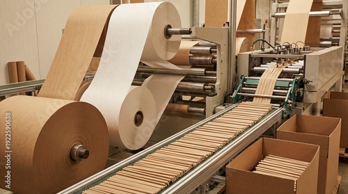 Industrial machinery processes large paper rolls, producing cylindrical paper sticks on a conveyor belt in a factory