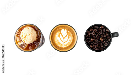 Overhead shot of iced coffee with ice cream, latte art, and coffee beans, black background