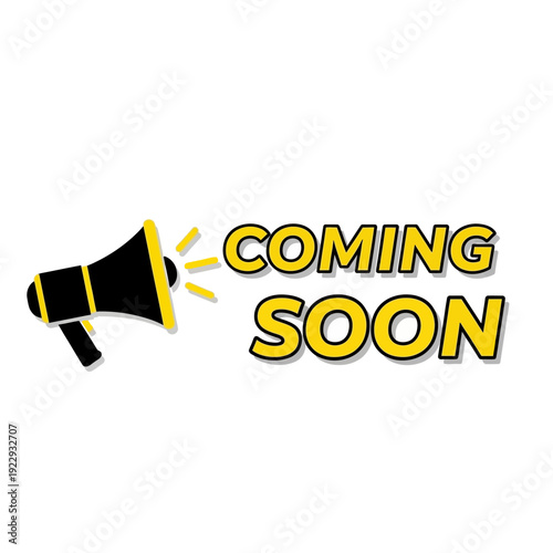 Megaphone announcing "Coming Soon" message in bold yellow text on an isolated white background.