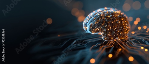 abstract digital brain on a circuit board background with copy space, in blue and orange colors concept of artificial intelligence or technology for web banner design Generative AI