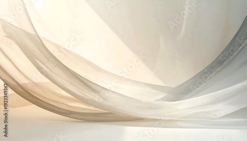Soft, translucent fabric cascades, catching light. Neutral tones and gentle curves create an airy feel