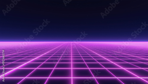Neon grid horizon retro futuristic landscape purple glowing floor vanishing point perspective