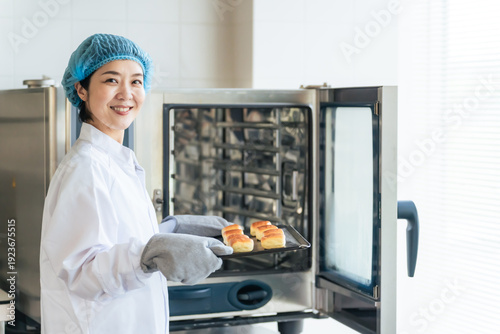 パン、ベーカリー、パン屋、オーブン、女性、白衣、調理、給食センター、宅食、食堂、調理師、パティシエ、パティスリー、職人、衛生、ヘアーネット、ミトン、焼きたて、お菓子、スコーン、料理教室、笑顔、カメラ目線、日本人、ミドルエイジ、中年、キッチン、厨房、レストラン、シェフ、清潔、明るい、ポジティブ、製パン、仕事、パート、アルバイト、食品、小麦、学校、給食、パン製造技能士、専門学校、製菓衛生師、フード、料