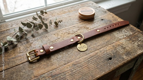 Premium leather pet collar with ID tag on rustic wooden table