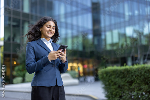 Young businesswoman standing outdoors in front of a modern glass building, actively using her smartphone and smiling, embodying communication and professional connectivity