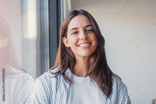 Portrait headshot of a confident, positive woman smiling naturally at the camera near a window, happy successful businesswoman or student posing for a professional profile photo