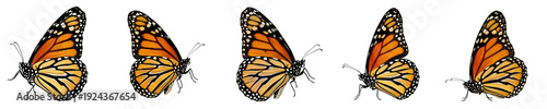 Collection of six monarch butterflies in elegant flight poses with vibrant orange and black wings, isolated on white background free stock image ./,