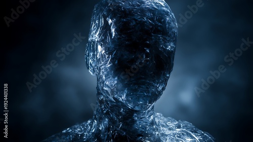 a frozen humanoid statue in black void, illuminated by dim blue light, ice texture details, melancholic and poetic feeling, fine art photography style,