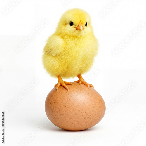 Motyw wielkanocny - mały, żółty kurczak stojący na jajku, na białym tle