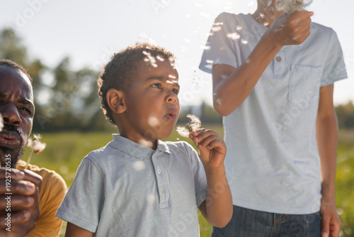 A father and his two kids share a moment in nature, blowing dandelion seeds and enjoying each others company as the sun sets.