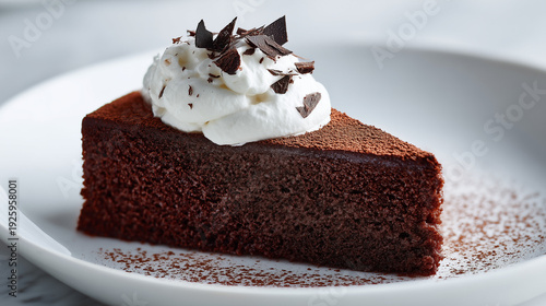 白い皿に盛り付けられたホイップクリームと削りチョコを添えた濃厚なガトーショコラのカット