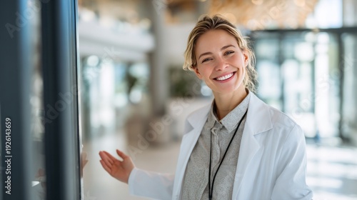 A modern medical entrepreneur opening the door to a bright and elegant office, smiling, wearing a medical outfit, inviting gesture, natural light, feeling of new beginnings and professionalism