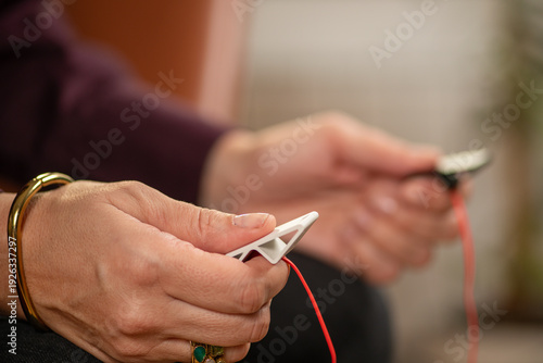 Tactile EMDR stimulation delivered through a pulsator to guide bilateral processing and emotional regulation. Highlights precise rhythm and clinical application.
