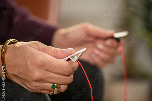 EMDR therapy using a pulsator device to produce alternating vibration tactile cues. Shows bilateral engagement, structured delivery, and trauma-informed treatment.