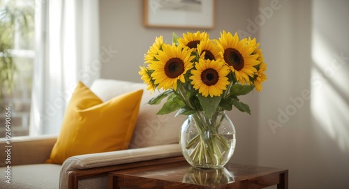 Sunflower bouquet next to chair with vibrant yellow cushion in real estate setting