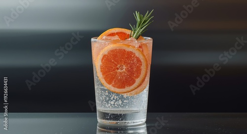 Sparkling hard seltzer drink with grapefruit slices and rosemary garnish