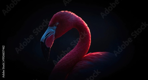 Tight frame of a glowing pink flamingo surrounded by dark ambiance