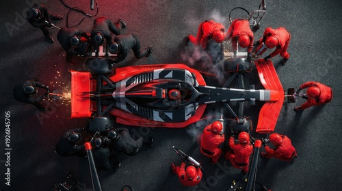 Birds eye perspective red and black formula race car in intense pit lane. Concept of high pressure motorsport operations, technical precision, race day teamwork and performance strategy.