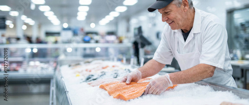 Fishmonger arranging fresh salmon fillets on ice in a supermarket fish display