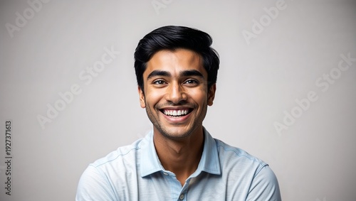 A young man with a warm smile exudes friendliness and positivity.